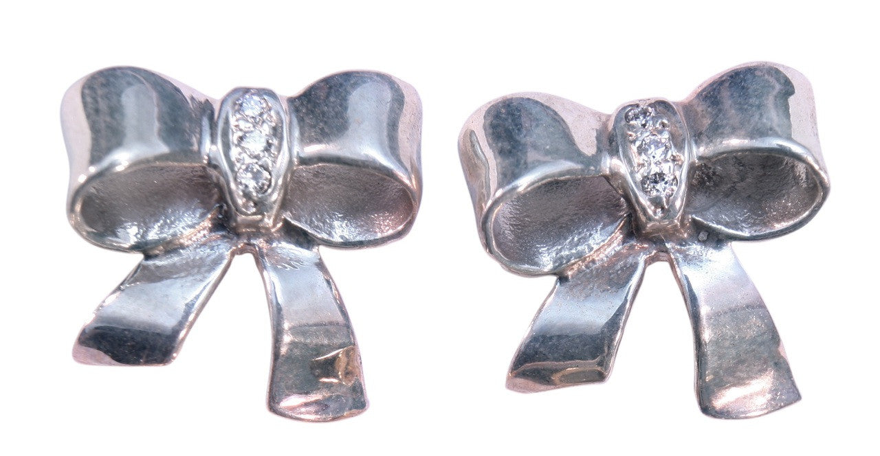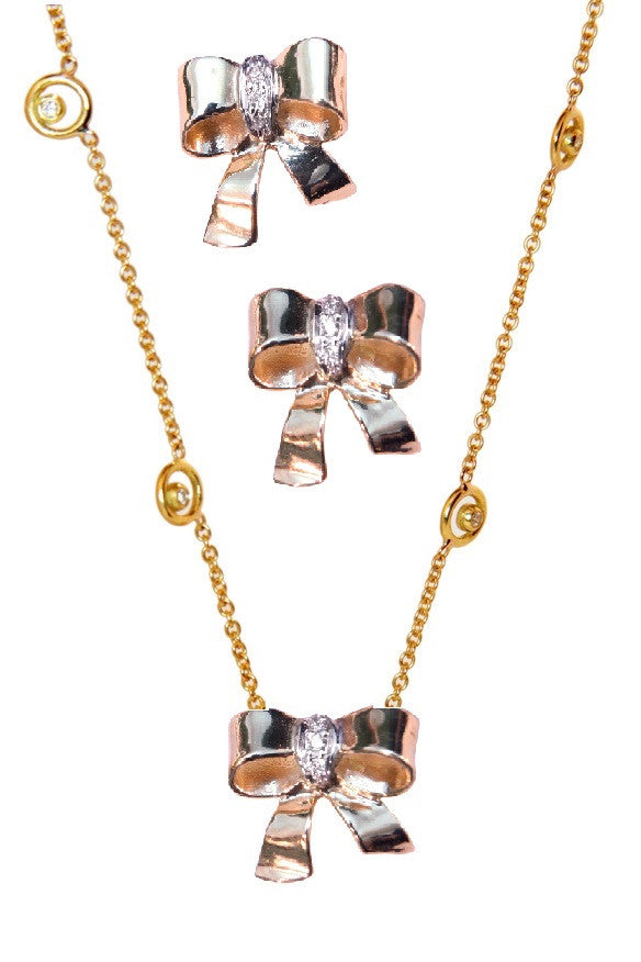 Like giftwrapping for your ears. Bow earrings shown in 18K and sterling silver, with 4 pts G-VS diamond centers. This can be customized for you with 18K gold overlay, black or white rhodium, or solid gold. Also shown here are a few necklaces which would also be very delicate, feminine and pretty. The necklaces would be made to order, so they would be made to suit your taste and budget perfectly.