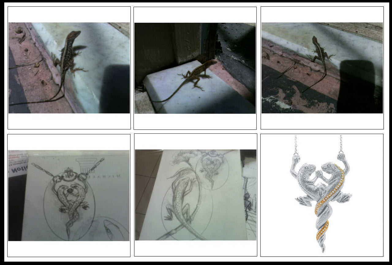 Of course I wanted to see the frisky lizards and asked him to send a picture. The lizards were gone so he sketched them, sent me the picture, and this necklace was created. See the original sketch in the attached pictures.