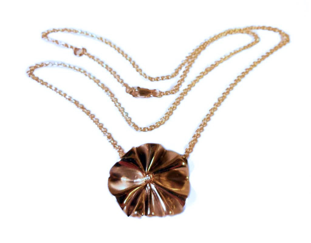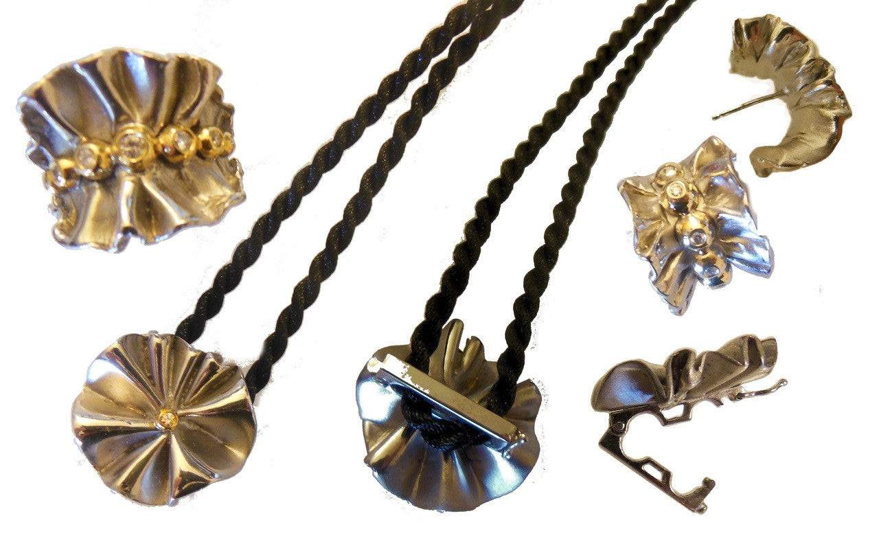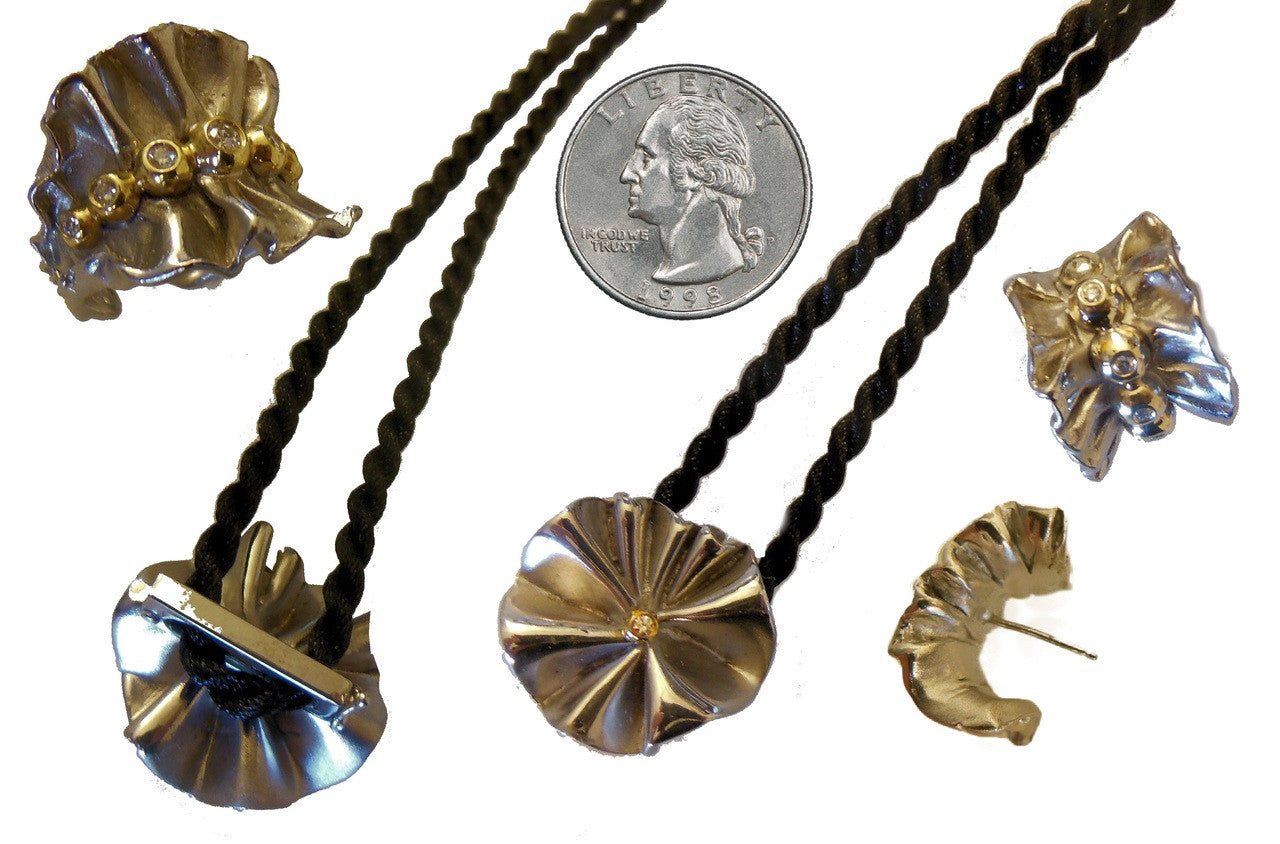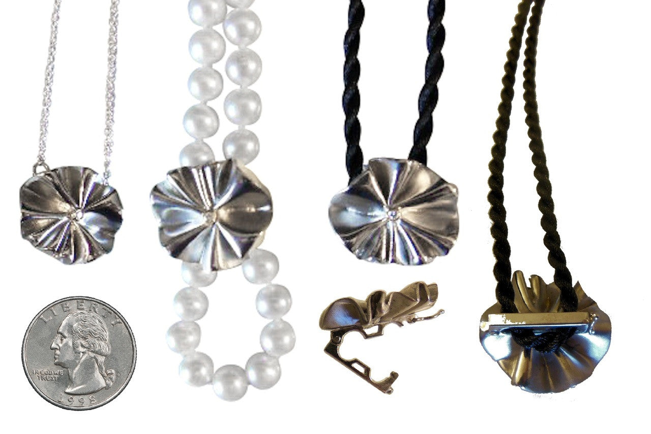 This pendant can be attached to a chain, or made as a clip that works on pearls, beads and cords. Sterling silver, solid 18K gold center dot with a diamond. Approx 2.5 pts G-VS diamonds..